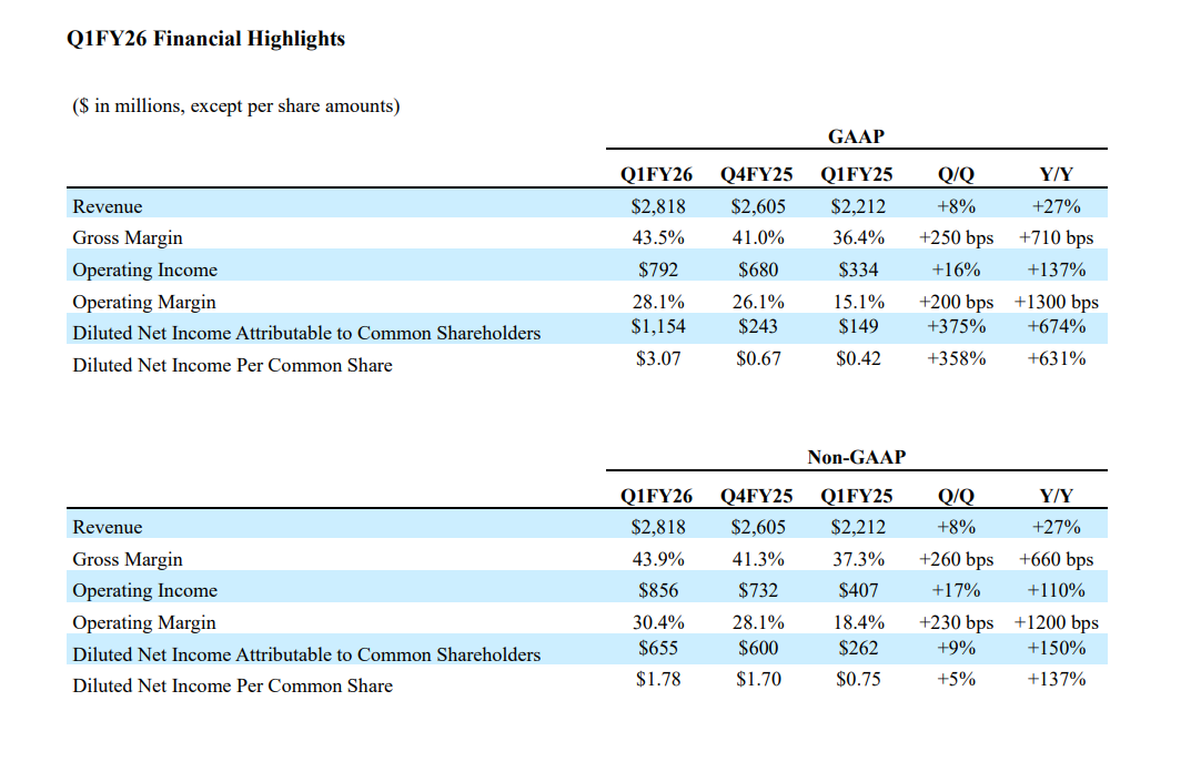 财报裸露,受益于AI和云数据需求的猛增,该公司的营收和牟利均竣事大幅增长。